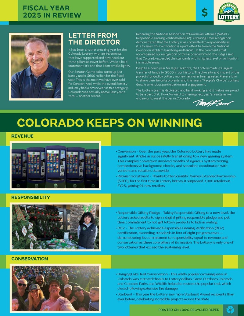 Unlike many state agencies, the Colorado Lottery operates as an enterprise fund. This means we do not receive a single dollar from taxpayers or the state’s General Fund. Our operations—from employee salaries to infrastructure, retailer commissions, and prize payouts—are entirely funded by the sale of our games.