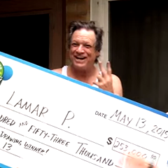 We Prize Surprised Lamar P. from Longmont at home with a check for a quarter-million dollars.