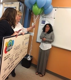 When she entered the faculty break room, the Colorado Lottery Prize Surprise crew was waiting there with a huge check for $1 million. Harasi was overcome with emotion as her colleagues cheered and clapped, some of whom still believed it was an elaborate prank. Randomly chosen from more than 300,000 entries, it was Harasi’s non-winning Torrent of Wealth Scratch ticket that won the Second-Chance Drawing.