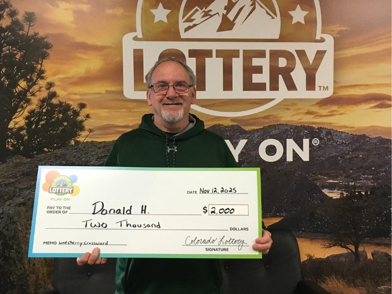 Felicitamos a Donald H., de Greeley, quien se llevó $2,000 con un boleto Wild Cherry Crossword Scratch comprado en Midnight Liquor, en la 11th Street. Planea usar el premio para ponerse al día con algunas cuentas y comprar regalos de Navidad… ¡llegó en el momento perfecto! ¡Felicidades, Donald, que este premio le ilumine la temporada!